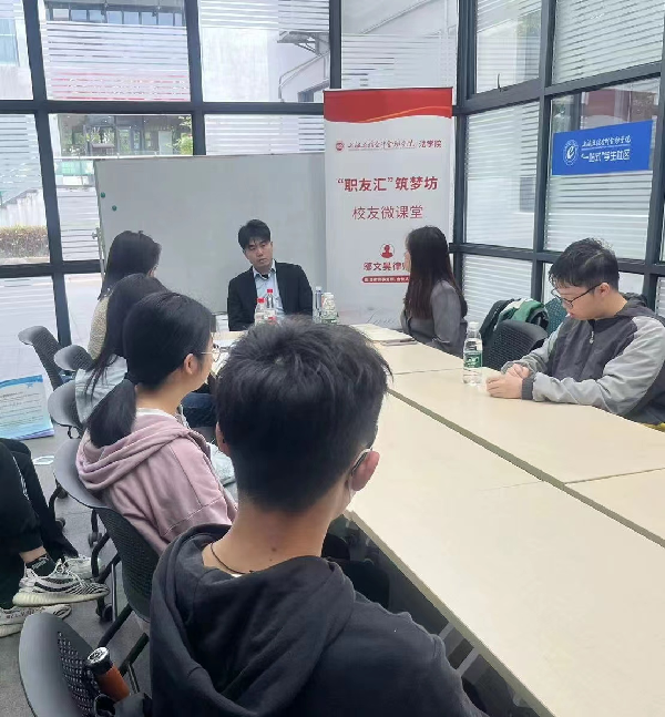 国浩律师集团事务所,成立于1998年,是中华人民共和国司法部批准组建的第一家律师集团事务所,国浩秉承“高效、诚实、信用、审慎、果断”的理念,时下已成为中国律师业居于领先地位的综合性律师事务所。旗下的律师团队学识精湛,经验丰富。邬文昊律师同时也拥有丰富的职业经验。为了加深同学们对职场竞争力的了解,让同学们学会通过评估多方面信息正确选择适合自己的职业,以及如何从初入职场的小白顺利过渡到合格职员,促使学生在初入职场时提高核心竞争力。邬律师与同学们进行了深度的交流。