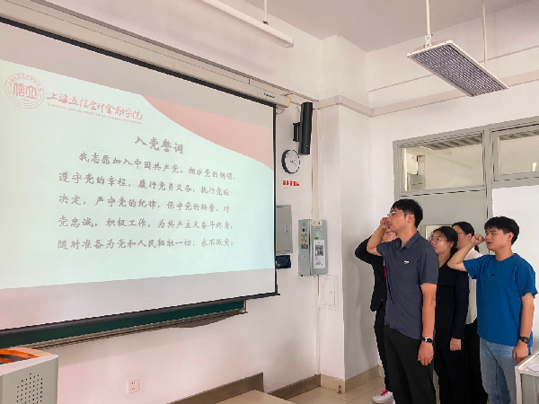 最后,诸明伟老师带领在场的新发展党员庄严宣誓。誓言声声,在空气中回荡,表达了大家为实现中华民族伟大复兴而奋斗的坚定决心。