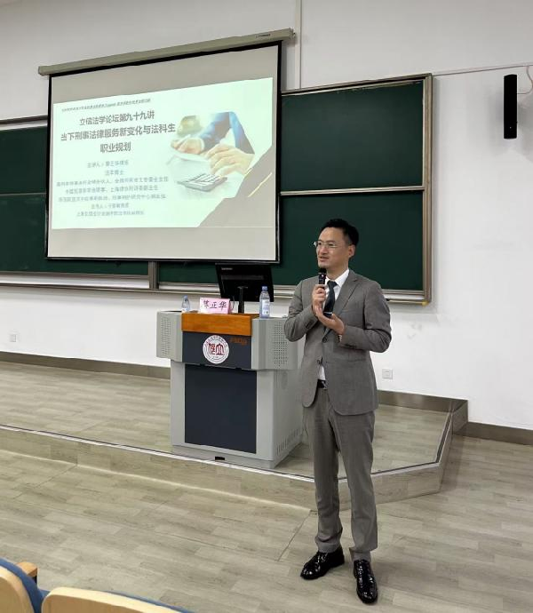 2024年10月30日下午,我院在六教213教室组织开展立信法学论坛第九十九讲,由北京市盈科律师事务所全国刑民交叉法律专业委员会主任、北京盈科律师事务所全球合伙人、北京市盈科律师事务所全国刑民交叉法律专业委员会主任、上海所管委会副主任、上海所刑民交叉法律事务部主任、上海律师协会刑诉法与刑事辩护业务研究委员会委员蔡正华律师为此次讲座的主讲人,法学院副院长于春敏教授作为主持人。本次讲座的主题为“当下刑事法律服务新变化与法科生职业规划”。