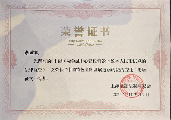 2025年11月13日,在上海金融法制研究会成立30周年庆典暨“中国特色金融发展道路的法治变迁”学术年会上,我院教师李瀚琰《上海国际金融中心建设背景下数字人民币试点的法律监管》一文荣获本次征文一等奖,获奖荣誉在研讨会优秀论文颁奖仪式环节正式授予。