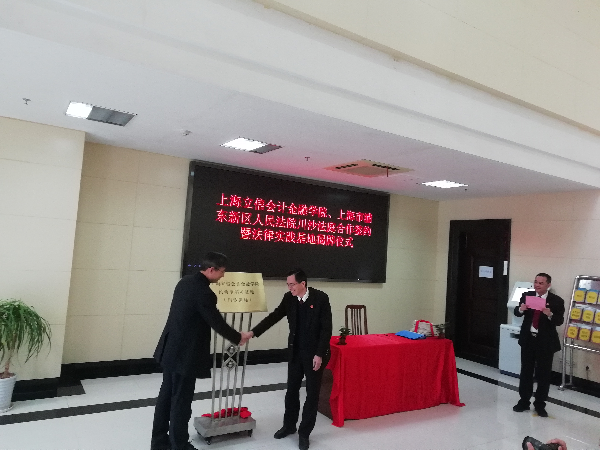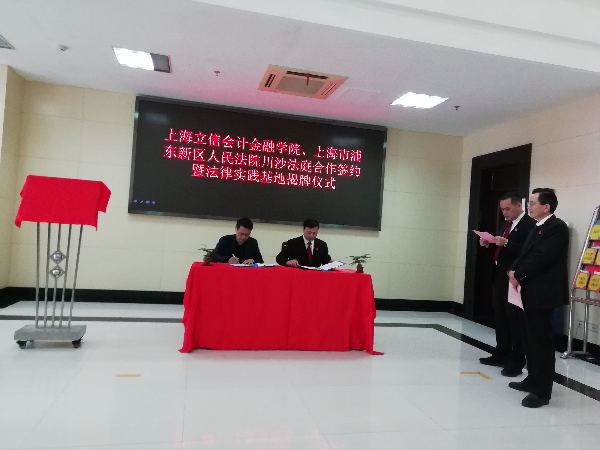 3月22日下午,我校法学院与上海浦东新区人民法院川沙法庭合作签约仪式暨民商事法律实践基地揭牌仪式在川沙法庭举行。我校朱亚兵副校长、产学研办公室主任陈霜华、法学院院长龙英锋、副院长徐利民和于春敏、浦东法院副院长傅玉明、政治部主任杜敏浩、川沙法庭庭长顾江平、副庭长张春华以及学生代表等四十余人参加签约仪式。