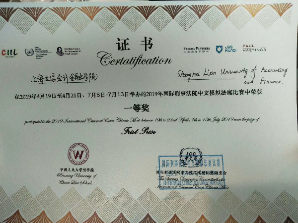 2019年7月8至13日,国际刑事法院中文模拟法庭比赛(“ICC中文赛”)决赛在荷兰海牙行。上海立信会计金融学院法学院代表队在本次中文比赛中,取得了总决赛一等奖的好成绩。国际刑事法院中文赛荷兰海牙总决赛是上海立信会计金融学院赛队面向世界,走向国际舞台,展现学校办学理念、学院教学重点、学生综合素养的良好契机。